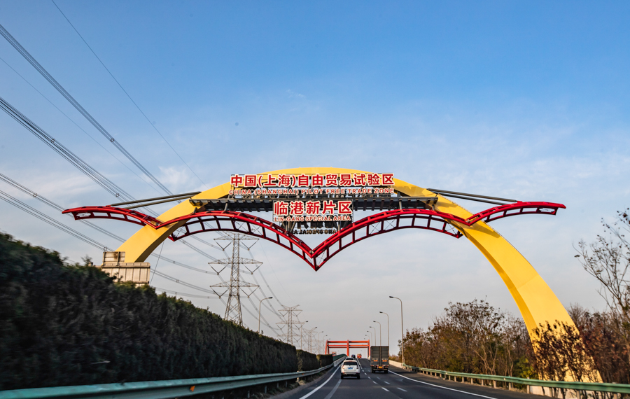 走进中国(上海)自由贸易试验区临港新片区,高速公路上的拱门在夕阳的照耀下熠熠夺目。新华网吴恺 摄