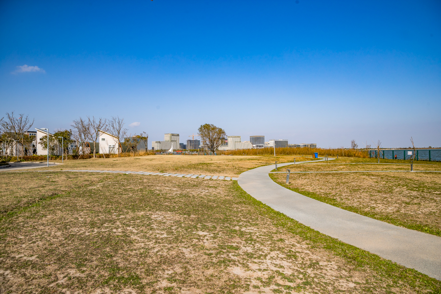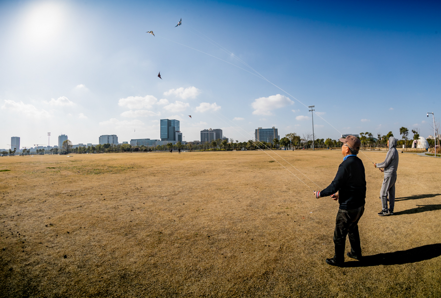 在滴水湖西岛上,居民正在岛上放风筝。新华网吴恺 摄