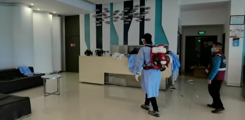 工作人员正在对酒店大堂消毒。 胡幸阳 摄